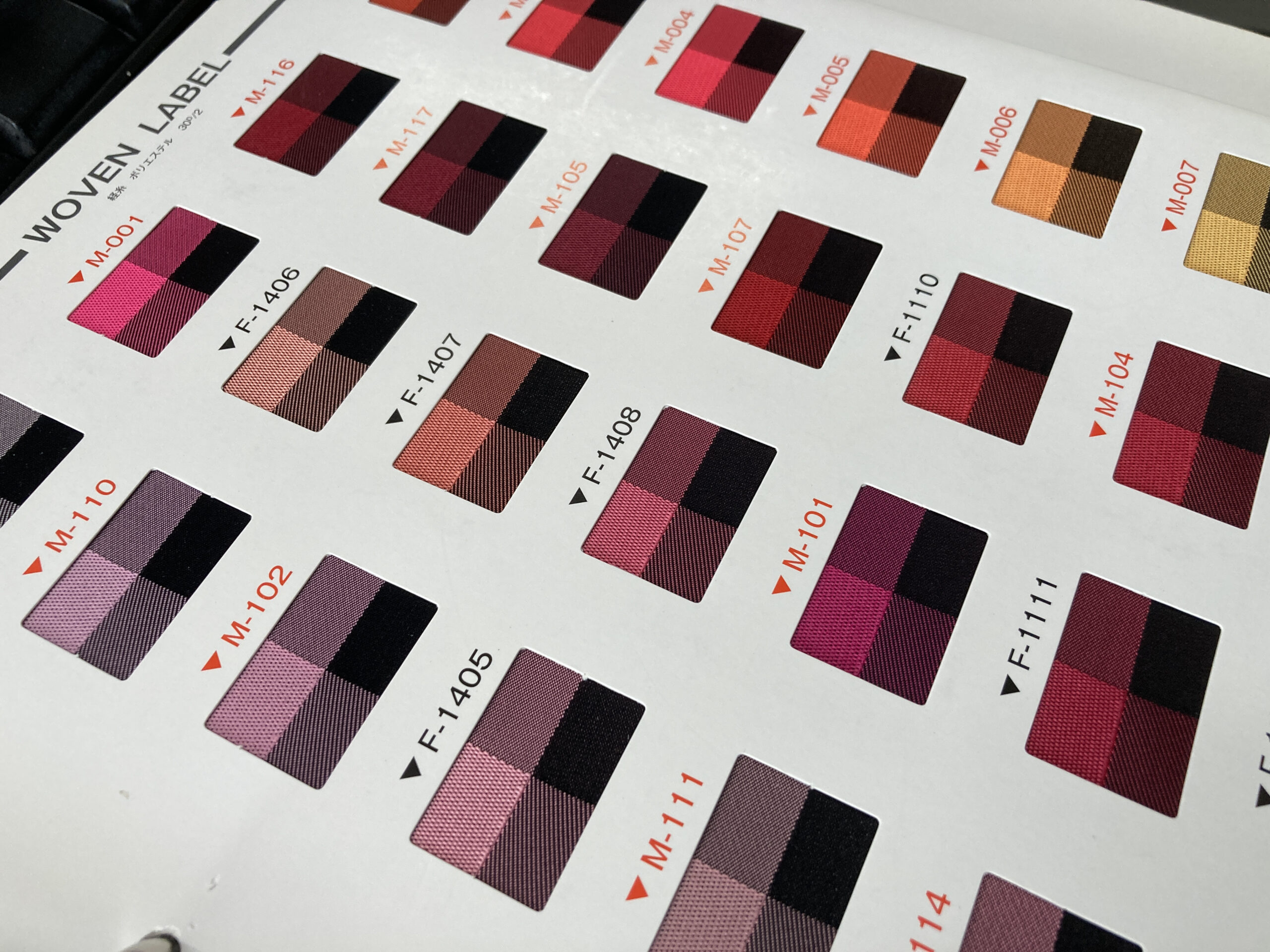 出口織ネームでは、織物設計図、糸の太さ、打ち込み回数の組み合わせを緻密に計算することで、プリントに迫る繊細なデザイン表現を可能にしています。